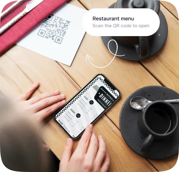 Download the ready‐made PDF menu — get a link and QR code. No apps, no registration. Ready‐made sticker templates for printing on tables and napkin holders.